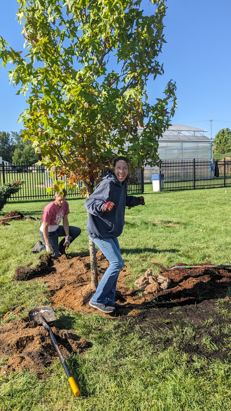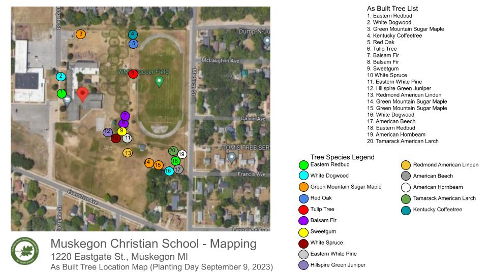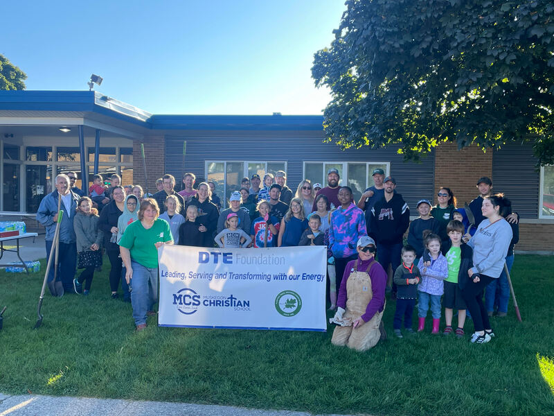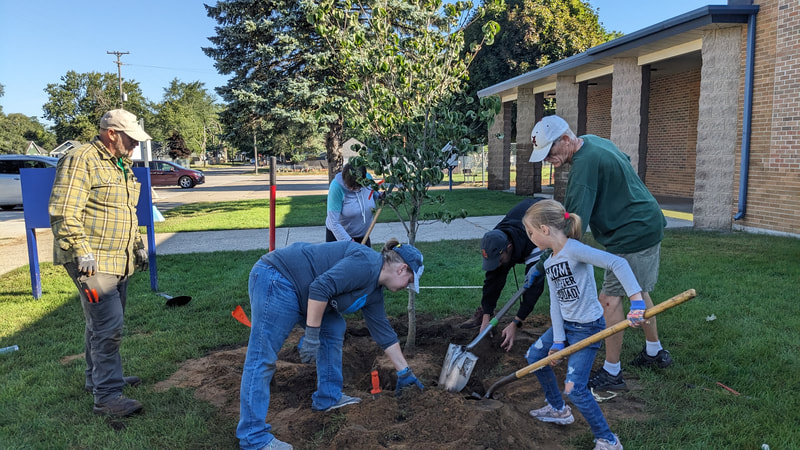 In this planting ReLeaf Michigan, DTE Energy Foundation, and Muskegon Christian School and volunteers planted 20 trees at the Muskegon Christian School in Muskegon on Saturday, September 9th, 2023. The trees planted here will create an educational resource for the school and help reduce excess water around the playground. We also planted maple trees that students can tap for maple syrup once the trees mature.