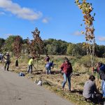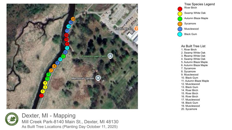 In this planting, ReLeaf Michigan, the DTE Energy Foundation, the city of Dexter, and volunteers planted 20 trees at Dexter Mill Creek Park on Saturday, October 11th. The trees planted along the stream are helping to shade the creek and surrounding area, reducing stream temperatures as well as helping to improve water quality for the creek’s inhabitants and recreational visitors.
