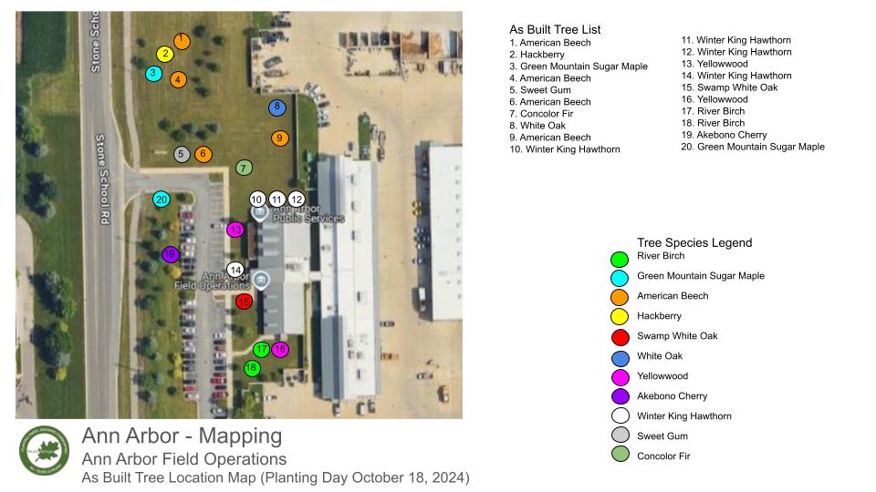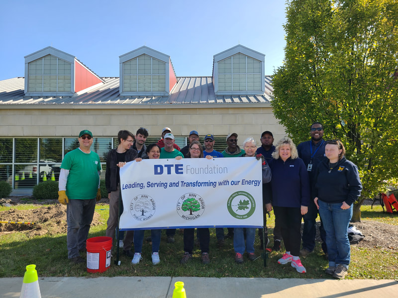 In this planting ReLeaf Michigan, DTE Energy Foundation, city of Ann Arbor, Ann Arbor Department of Public Works, and volunteers planted 20 trees at the Wheeler Center on Friday, October 18th. The trees were planted to increase overall tree canopy and beautify the Wheeler Service Center grounds.