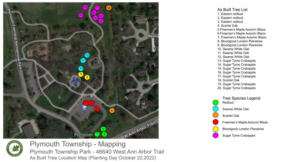 In this planting ReLeaf Michigan, DTE Energy Foundation, the Plymouth Township Environmental Leadership Commission, Plymouth Township, and volunteers planted 20 trees at Plymouth Township Park on Saturday, October 22nd, 2022. The goal of this planting was to broaden species diversity and to add more shade and walkway trees. The trees planted will diversify and increase the overall tree canopy while providing shade, environmental, aesthetic and health benefits!